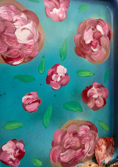 Meine Idee, Bilder, die witterungsbeständig sind, zu malen, entstand durch „Zufall“. Im Garten lag eine alte Fettpfanne vom Grill und sollte zum Recycling gebracht werden. Irgendwie lag sie da sehr lange… Da kam mir der Gedanke: warum nicht bemalen?